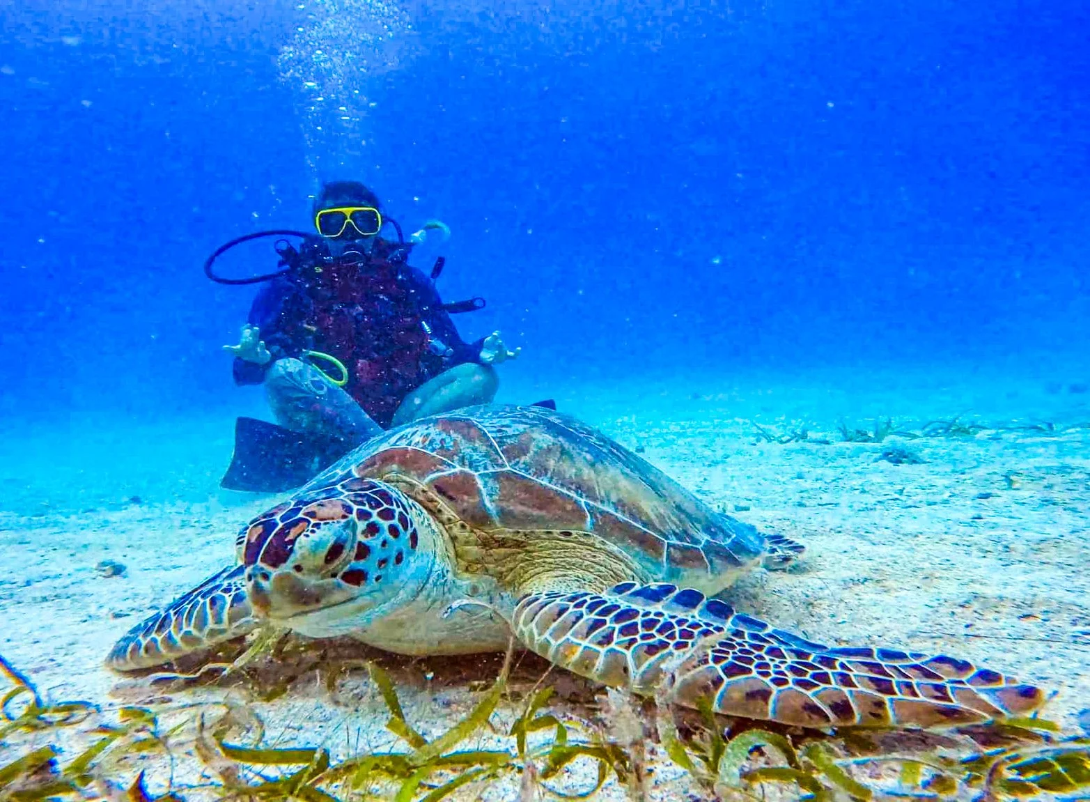 By the time we got toward the end of the dive, Ruthie decided to take us back to an original spot she told us we would likely see sea turtles, but hadn’t in the beginning of the dive. And right there, in front of my eyes, I see a mass on the ground and as we get closer - it is a HUGE absolutely STUNNING green sea turtle!!!!!! I gasped so many times through my regulator that I completely threw my bouyancy off by inhaling too much and lifting so high in the water, it took me what felt like forever to equalize my ears to get back down again. Lesson Learned!