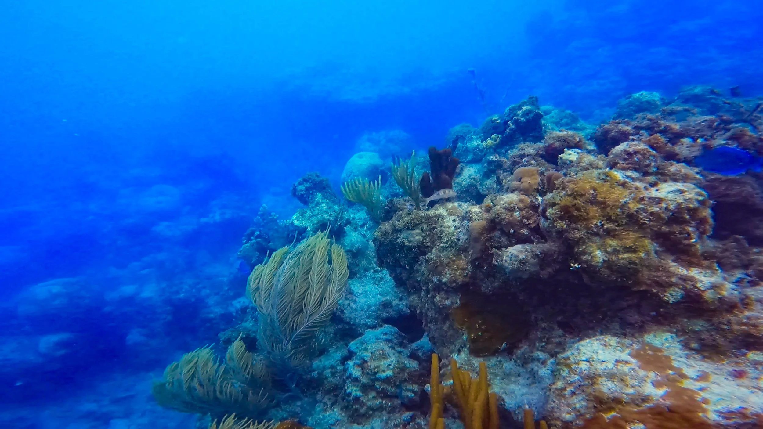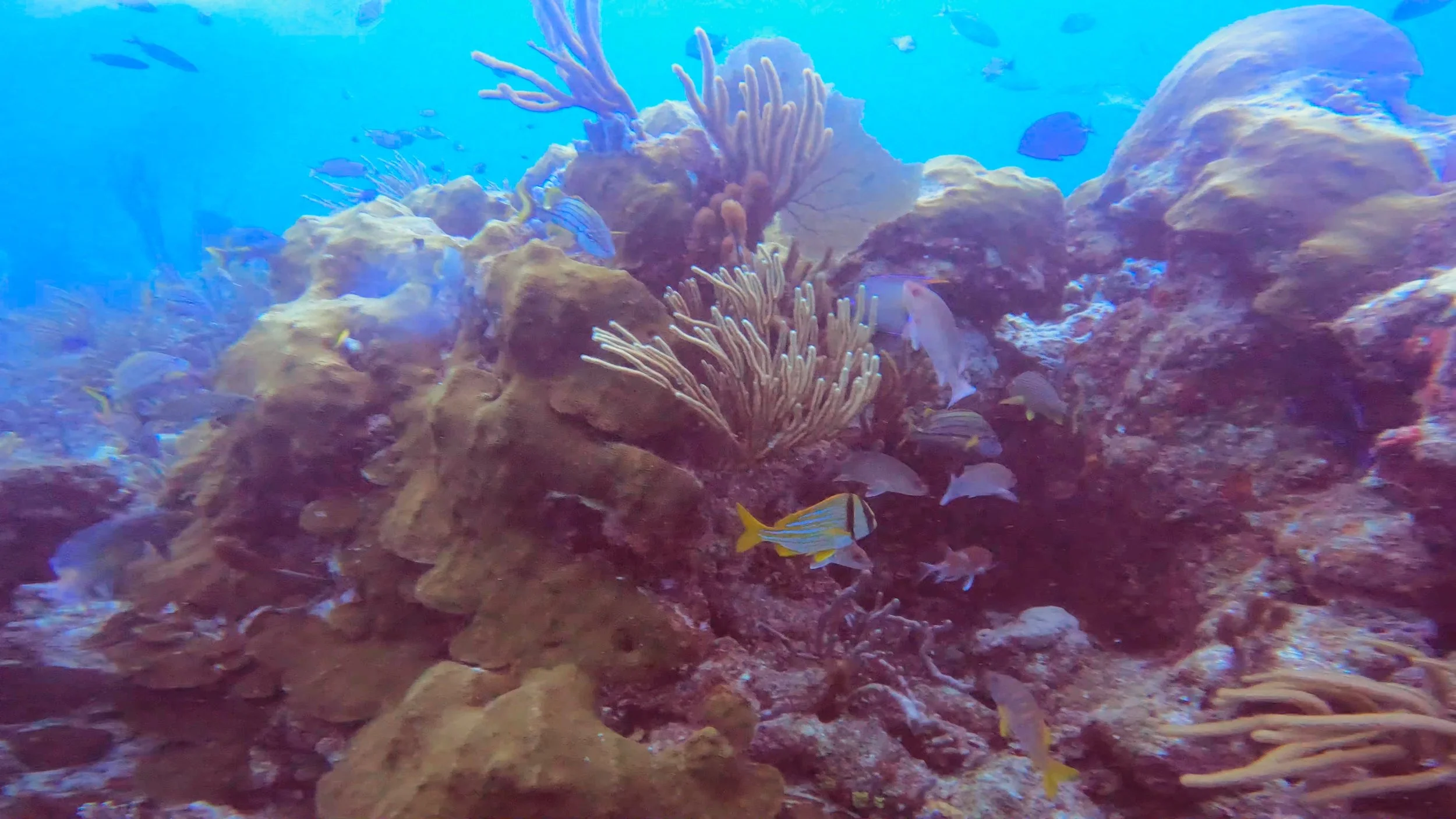 This screenshot from my GoPro video hardly does justice to the amount of color you see with the naked eye radiating off the coral and fish!